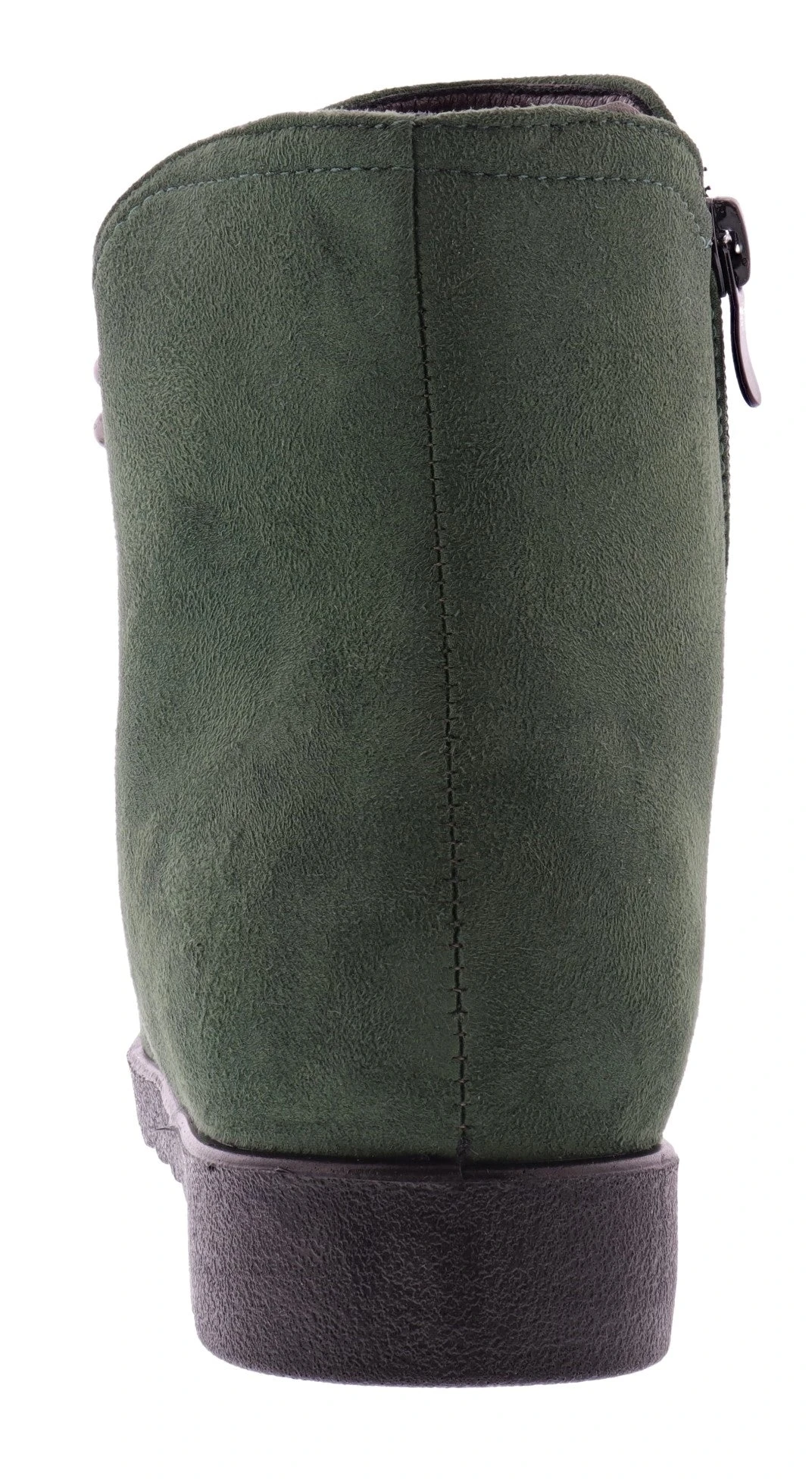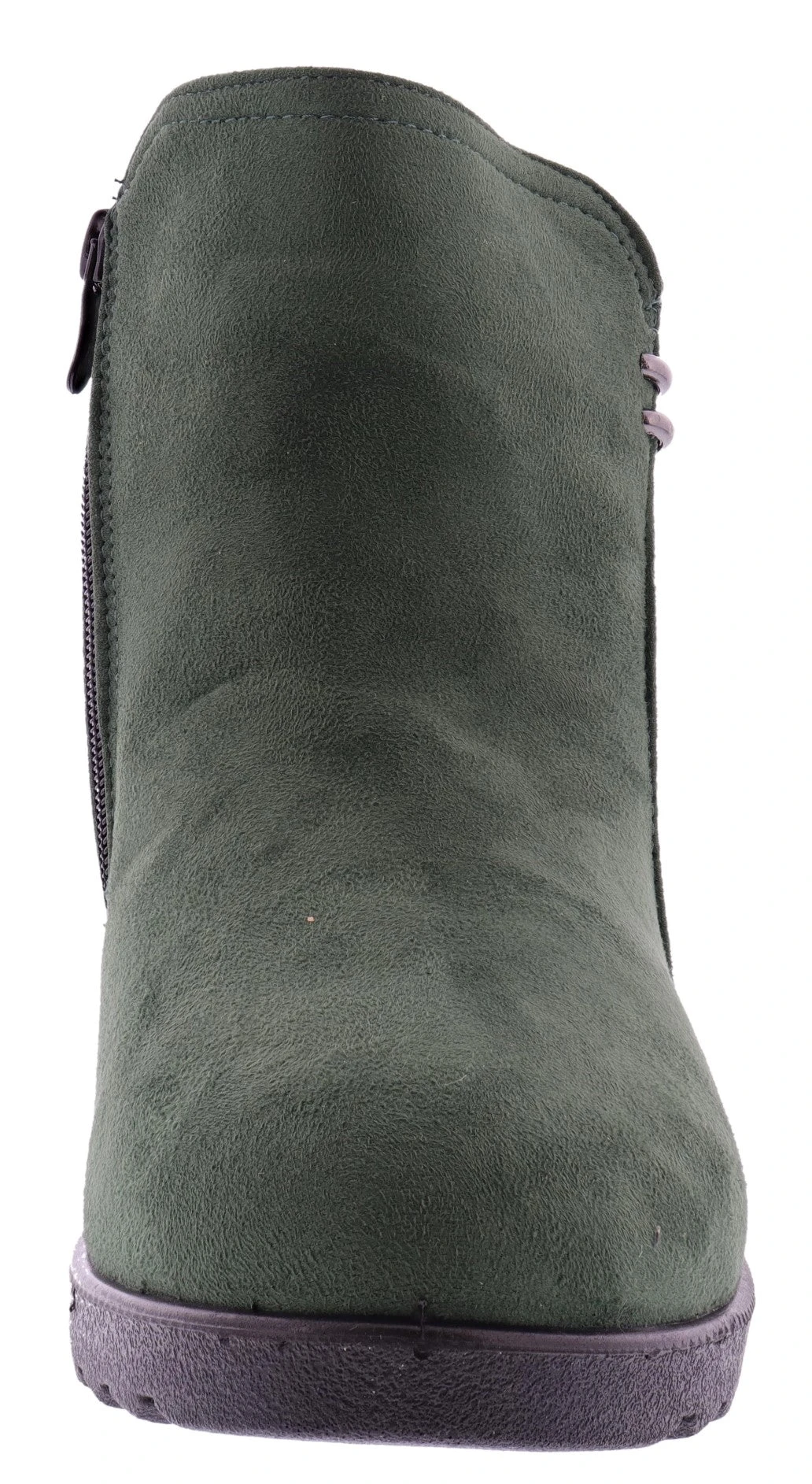 The women’s Flexus Grenzia by Spring Step is a fashionable waterproof microfiber bootie decorated with two gun metal half-ring ornaments and tonal stitching.
