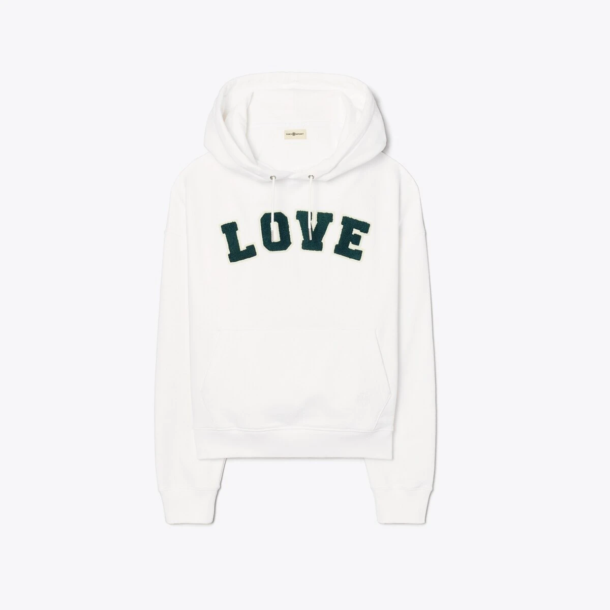 From our Love Capsule, a celebration of love updates a must-have style in classic American sportswear. Featuring an oversized fit, the ultra-cozy hoodie is detailed with embroidered chenille patches and a front kangaroo pocket. Crafted in heavy French Terry cotton for superior warmth, the hooded sweatshirt is a perfect layer to wear post-workouts or for an off-duty style.