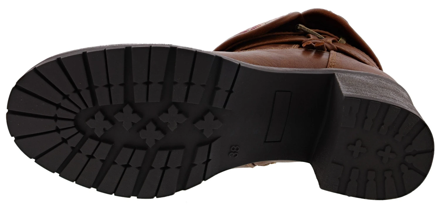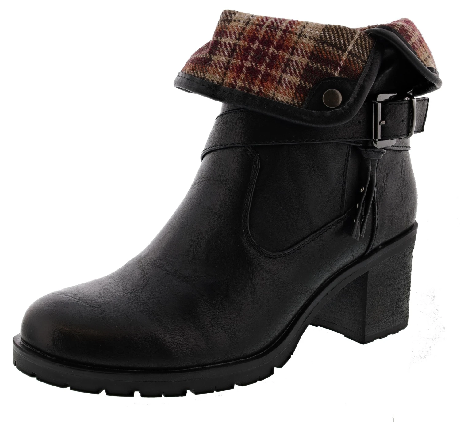 Patricia Steppe Side Zip Closure chunky heeled boots with a fold-down collar beautiful plaid and a crossed ankle strap. Adjustable buckle and studs on a loop knot on a black chunky heeled boots. Closure Buckle Zipper Comfort Flexible Sole Padded Insole Vegan Friendly.