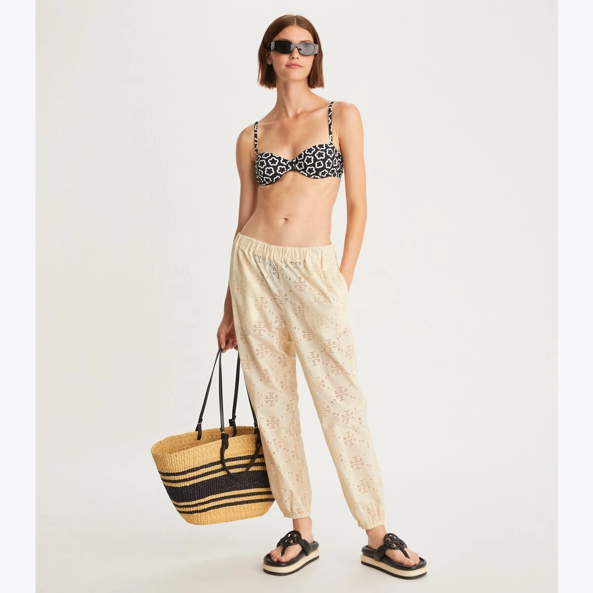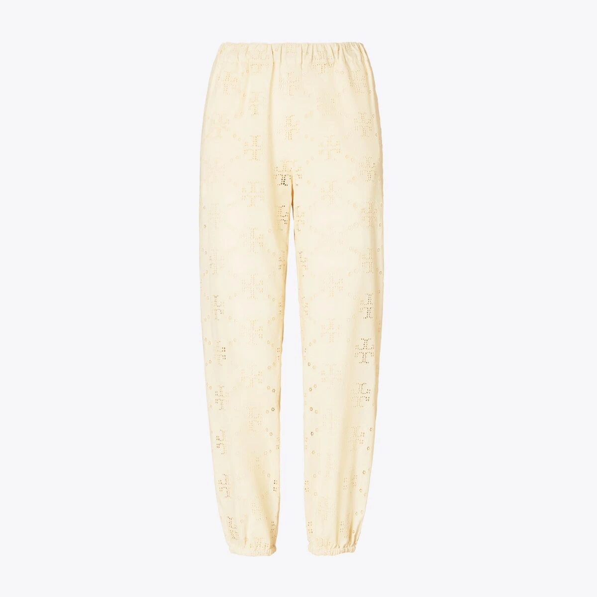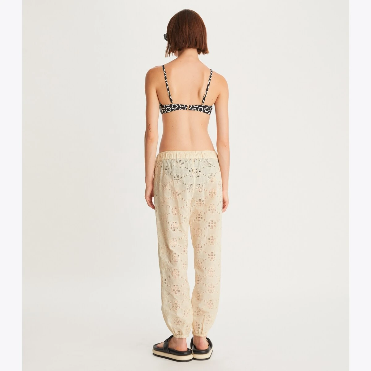 A warm-weather favorite, updated with broderie anglaise cutouts. Comfortable and lightweight, our beach pant has a pull-on waist and pockets for added convenience. It packs up easily and is perfect for wearing over a swimsuit, with a cropped t-shirt or the matching tunic.
