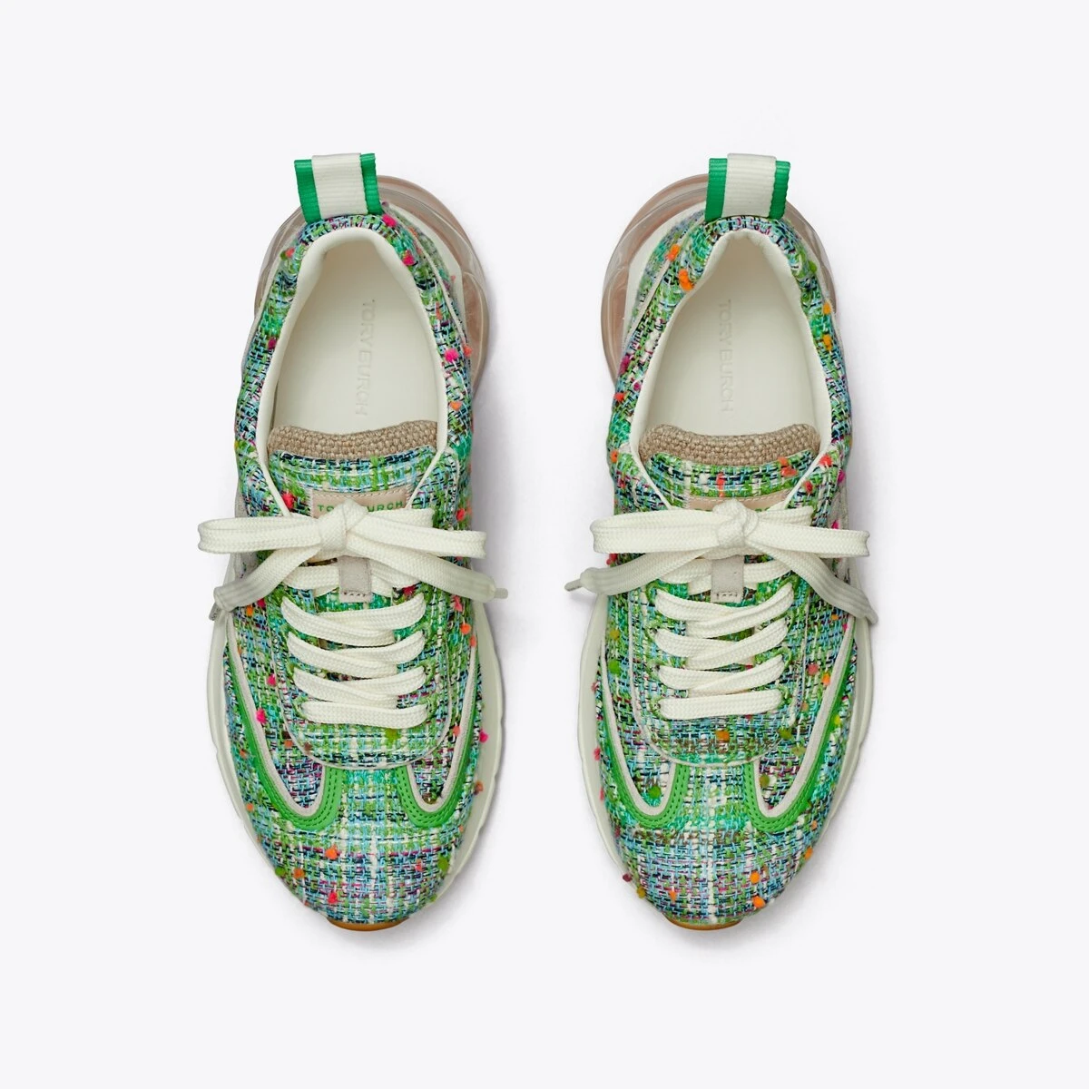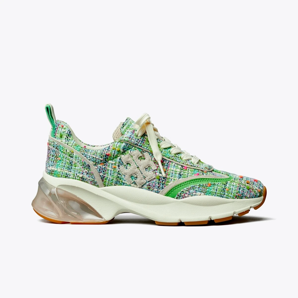 Our trainer is characterized by superior comfort, flattering lines and discreet symbols of luck — a longtime fascination of Tory’s. An oversized ergonomic sole adds lift, deep ankle scoops elongate the leg and a structural wishbone within the cushioned midsole acts as a cambrion, reinforcing the shoe’s internal support system. Crafted in tweed and soft leather with a suede trim.