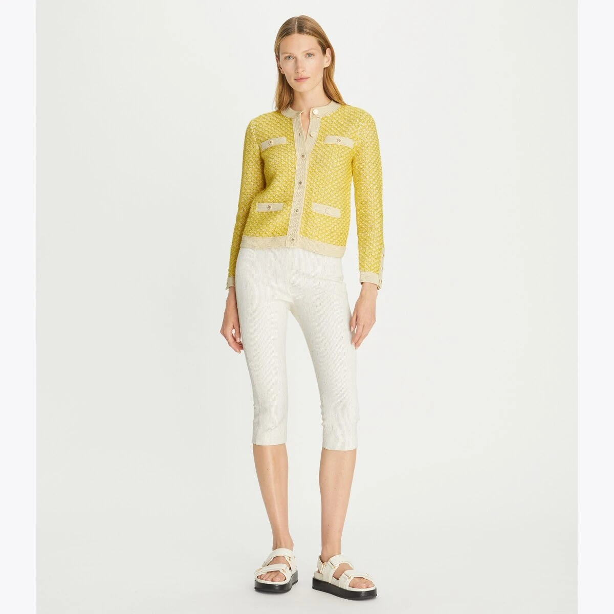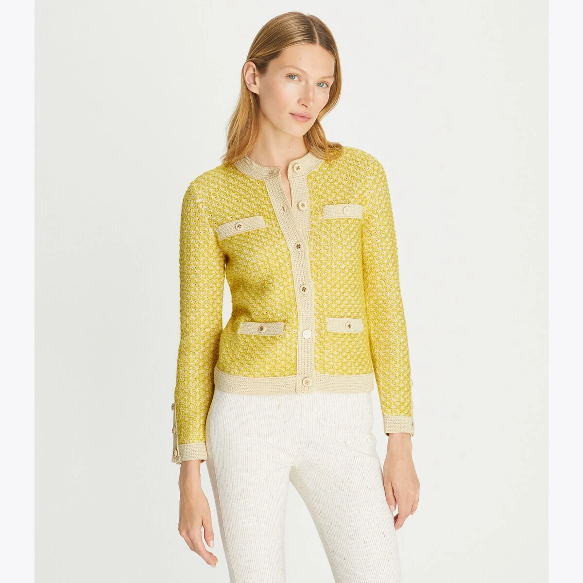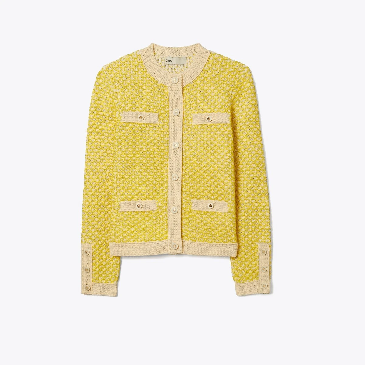 A tailored take on the ladylike sweater. The Kendra Cardigan is made from Italian-crafted linen tweed detailed with contrasting crochet trim and a smooth silk lining featuring our T Monogram. It is a polished and versatile layer to wear over everything from t-shirts to sweeping dresses.