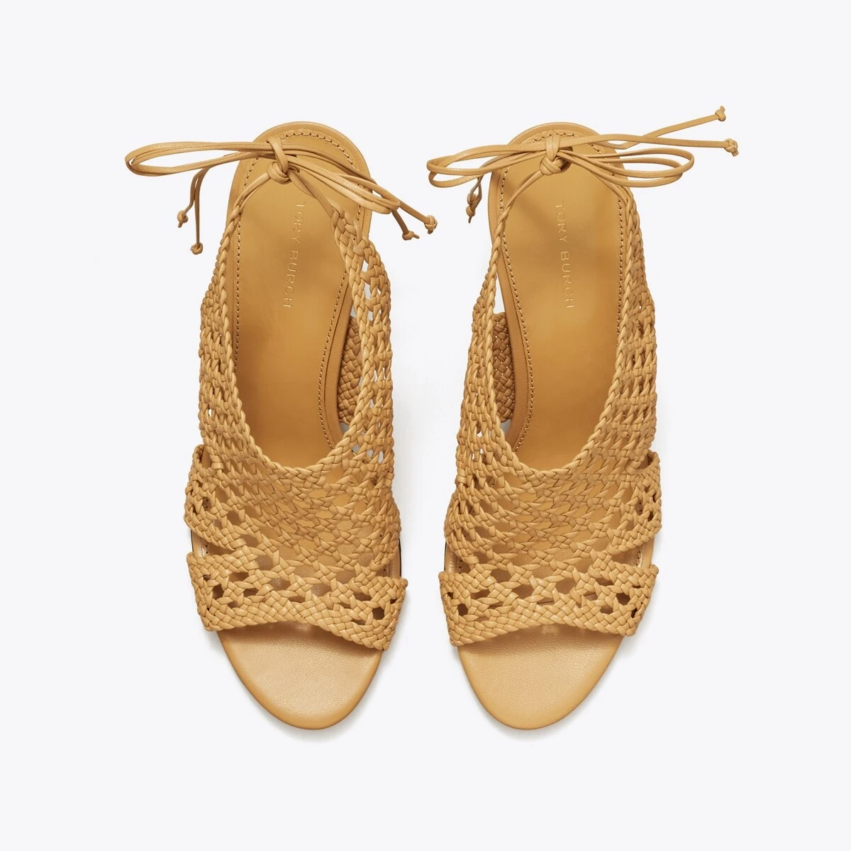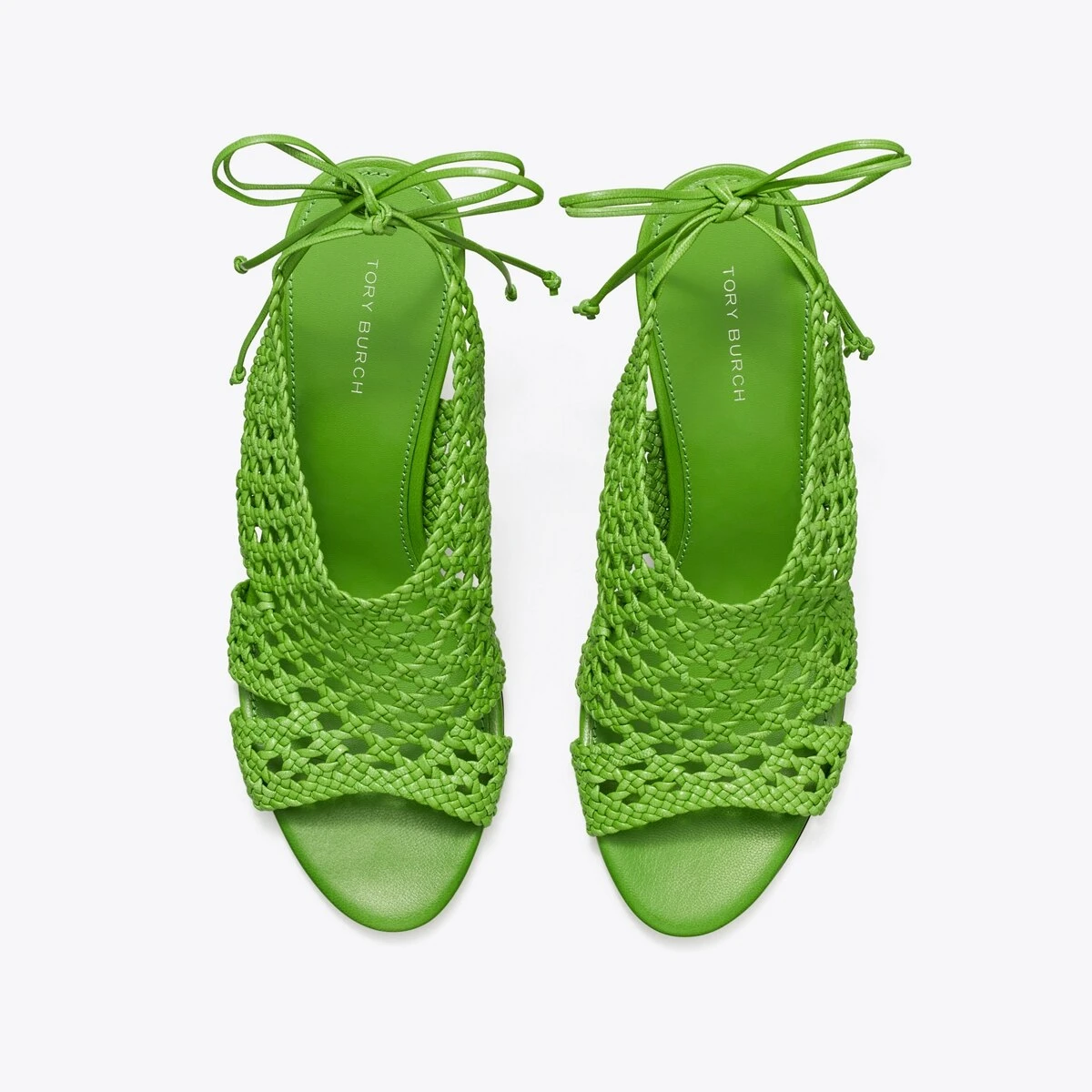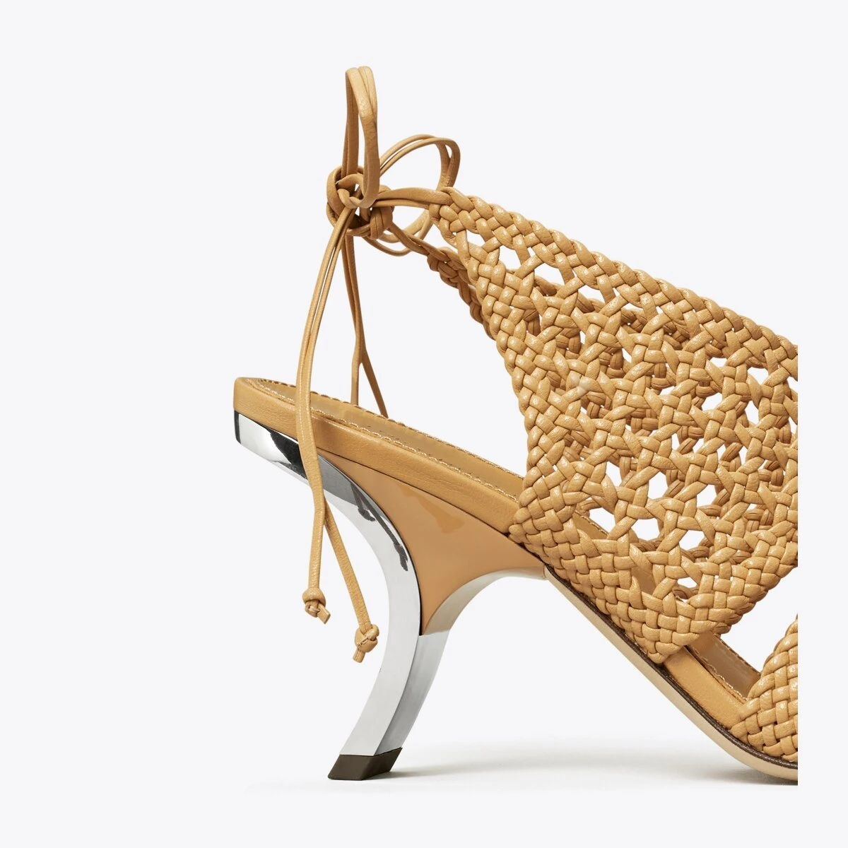 Hand-woven leather is set on a bold, curved metal heel. Delicate straps tie around the ankle, adding elegance and comfort. Due to the woven leatherwork, the soft upper offers a flexible and individual mold.